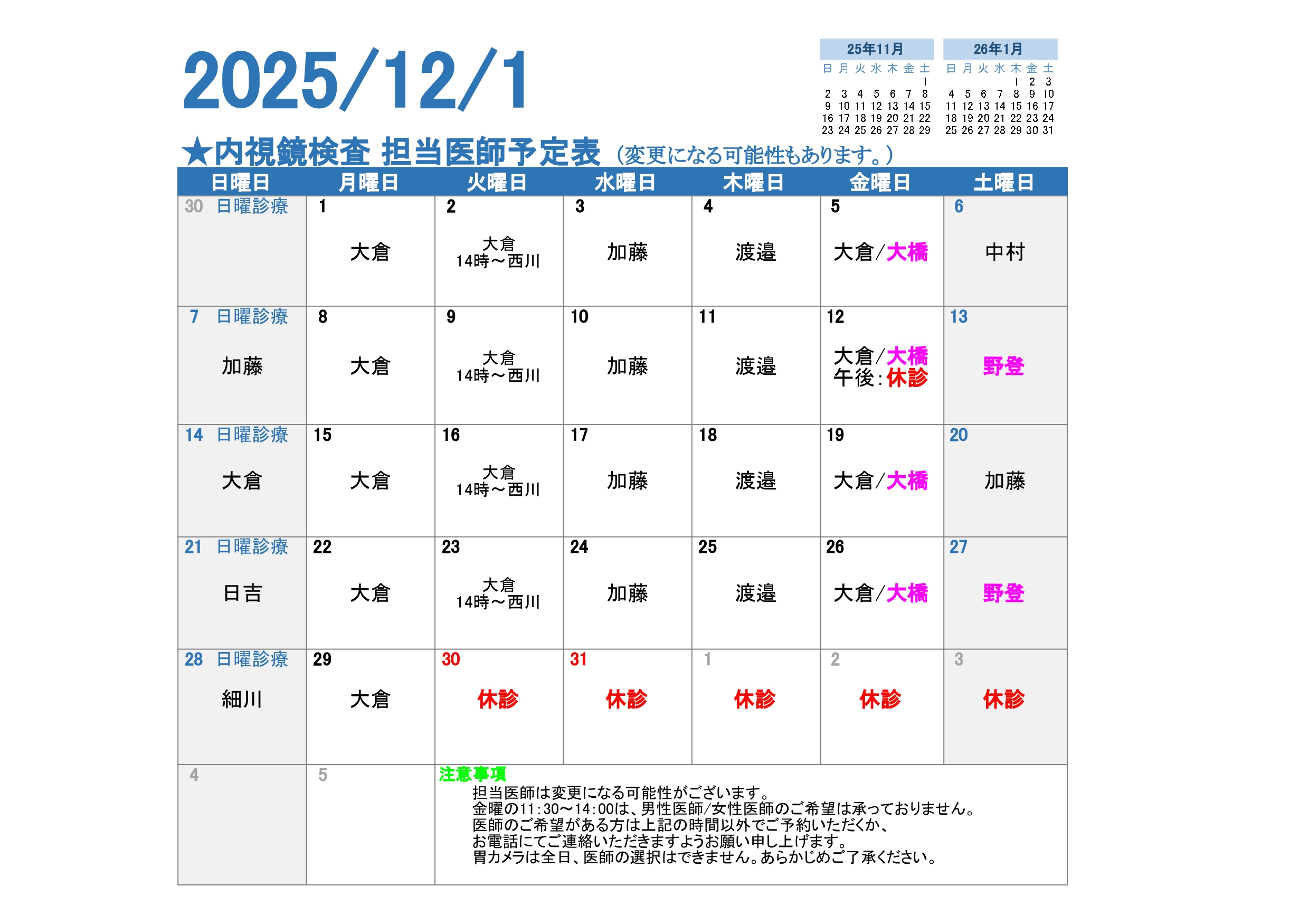 2025年12月の内視鏡担当医予定表です。 ピンク字が女性医師です。 診療担当医師は変更となる場合がございます。予めご了承ください。